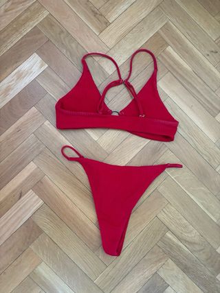 Conjunto de bikini de dos piezas en color rojo. El top tiene un detalle de aro metálico en el centro. - Tejido elástico acanalado. - Tirantes ajustables. - Braguita de corte alto.