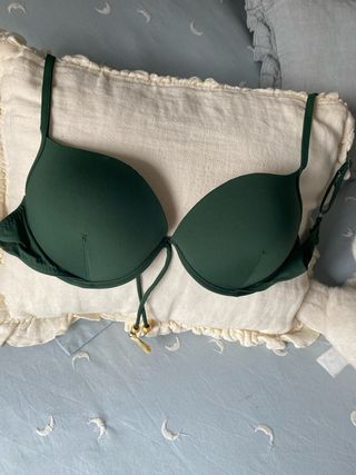 Bikini verde oscuro de Oysho con un diseño moderno y favorecedor. Talla M. Nunca usado. Detalle de volantes en los tirantes. Braguita de talle alto.