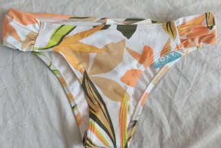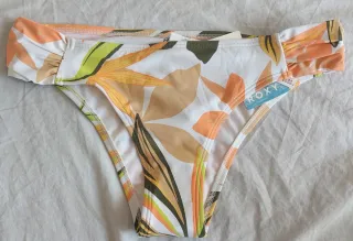 Braga de bikini de la marca Roxy con un llamativo estampado tropical. Totalmente nueva con etiqueta. La última foto es de la propia marca. - Diseño con volantes en los laterales. - Cintura elástica. - Estampado multicolor sobre fondo blanco.