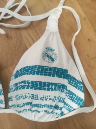 Conjunto de bikini con diseño del Real Madrid. - Parte superior con tiras ajustables. - Braguita con estampado. - Detalles en color turquesa.