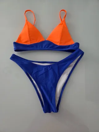 Conjunto de bikini de dos piezas con un diseño moderno y llamativo. - Parte superior tipo triángulo. - Braguita de corte alto. - Combinación de colores vibrantes.