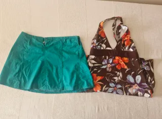 Conjunto de vestido de playa y minifalda. - Vestido con estampado floral. Puerto Bikini - Minifalda lisa en color verde. Mango 40