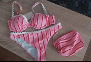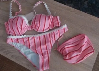 Conjunto de bikini con un diseño a rayas. - Parte superior con copas. - Braguita a juego. - Incluye un pequeño bolso a juego.