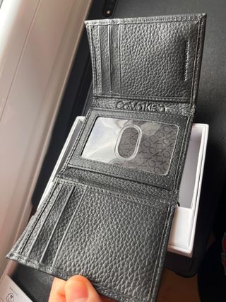 Cartera de la marca Calvin Klein para hombre, en color negro y completamente nueva. - Diseño clásico y elegante. - Material de cuero texturizado. - Protección RFID integrada. - Nuevo comprado en USA