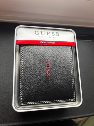 Elegante billetera de la marca Guess, presentada en su caja original. - Diseño en color negro. - Acabado liso y moderno. - Incluye placa metálica con el logo de Guess. - Nuevo, comprado en USA.