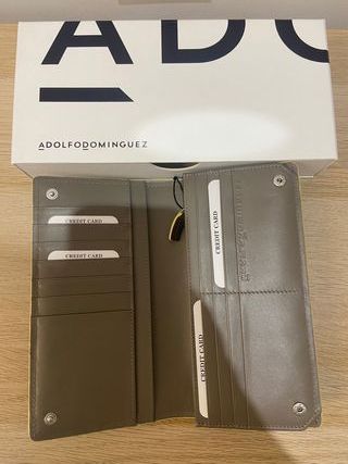 Cartera billetera en piel de ADOLFO DOMINGUEZ Nueva sin estrenar. Cierre solapa con clics, compartimento interior para billetes, tarjetas y monedero interior con cremallera. Color gris con bordes crema