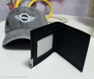 Conjunto de gorra y billetera con el logo de Mini Cooper. - Gorra de color gris. - Billetera de color negro.