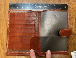 Práctico organizador de viaje o billetera de cuero. - Cierre con botón. - Bolsillo exterior con costuras.