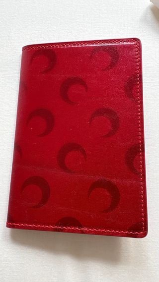 Funda para pasaporte de la marca Marine Serre. -Edición especial para Pitti Uomo - Diseño con estampado de lunas. - Color rojo vibrante. - De cuero, la piel tiene alguna marca como se aprecia en las fotos.