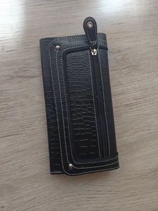 Cartera de piel sintética en color negro. - Diseño elegante con costuras. - Cierre de botón a presión. - Compartimentos interiores.