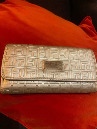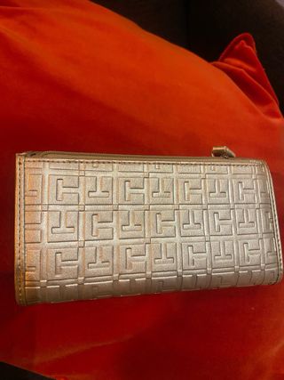 Elegante billetera para mujer. Tiene un poco cuarteado el interior, no es piel. - Diseño con monograma. - Cierre de solapa.
