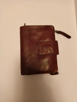 Artículo de muy buena calidad. Sin usar. Con cantidad de compartimentos para tarjetas, billetes, e incluso algunos con plástico para fotos. Cartera súper completa. Marrón muy oscuro.