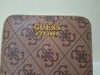 Cartera con el distintivo estampado monogram de Guess. - Diseño con cremallera. - Detalle de logo dorado. - Acabado en marrón y beige.