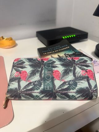 Cartera con un diseño tropical de palmeras y flamencos rosas. Cierre de cremallera. - Estampado Exotic con palmeras y flamencos. - Cremallera completa para un acceso seguro. - Diseño llamativo y colorido.