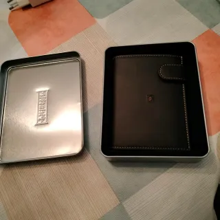 Elegante cartera billetera para hombre. - Fabricada en cuero. - Diseño vertical. - Múltiples compartimentos para tarjetas y billetes. - Incluye tarjetero extraíble. Nueva, sin uso, con pérdida de estrellas en la tapa, al natural no se aprecia prácticamente.