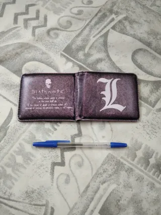 Cartera inspirada en Death Note con diseño de la L y texto. - Diseño de calavera y texto Death Note. - Símbolo L en el interior. - Texto de las reglas de Death Note.
