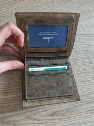 Billetera de piel de hombre. Nunca se ha usado. Ligero desgaste por el paso del tiempo. Color marrón. Medidas: Alto 13cmt Ancho 9cmt