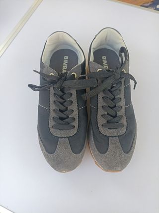 Zapatillas casual Bimba y Lola en color negro y gris. Son ideales para un look deportivo y cómodo. Apenas están usadas más de 3 veces, se puede apreciar en la foto que están limpias y nuevas. - Tela gris de ante y la negra estilo neopreno. - Suela de goma resistente. - Cordones negros.