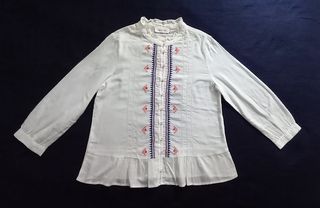 Blusa blanca de algodón con un diseño de bordados en el frente. Tiene un cuello con volante y un bajo con fruncido. Mide aproximadamente (por la espalda) Ancho de hombro a hombro 39 cm De sisa a sisa 51 cm Bajo 54 cm Largo del hombro al bajo 60 cm De la sisa al bajo 34 cm Manga 51 cm - Mangas largas. - Cierre de botones. - Detalle de bordado en hilo azul, rosa y marrón. - Sólo hago envíos