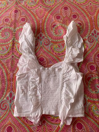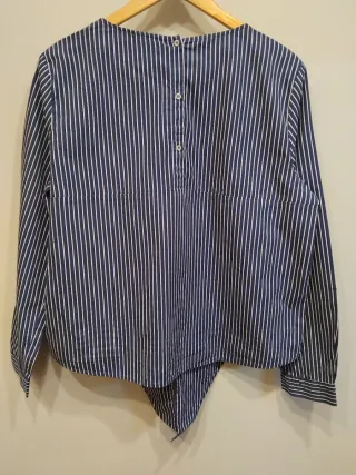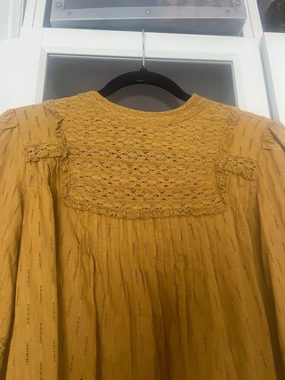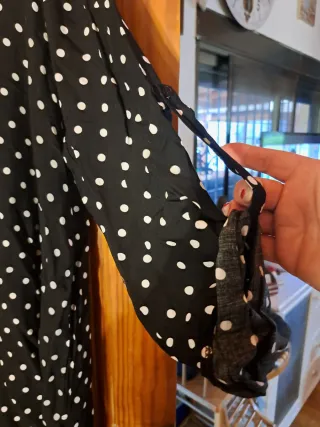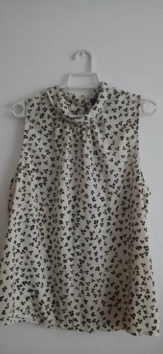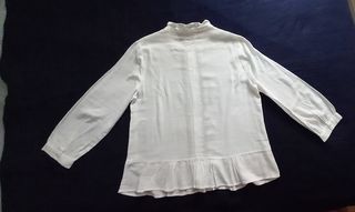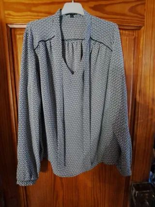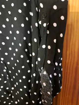 Blusa de manga larga con un diseño delicado y femenino. En la etiqueta pone talla M, pero es muy pequeña (S/XS). - Tejido ligero con estampado de lunares. - Detalle de volantes en el bajo. - Fruncido frontal con botones. - Mangas abullonadas.