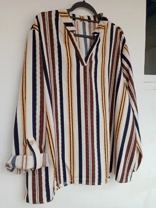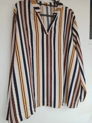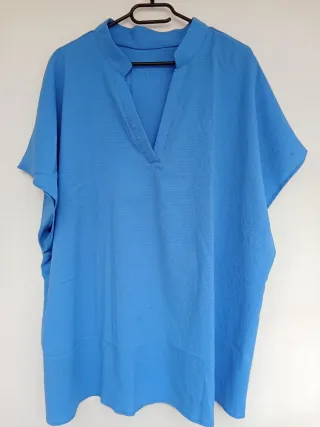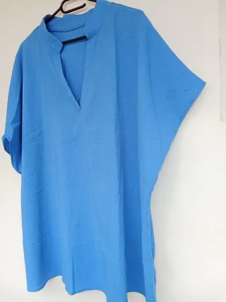56cm de sisa a sisa. 68cm de Largo. Tejido ligero semitransparente. Cierre parcial con botones en la parte delantera. Cuello Mao.