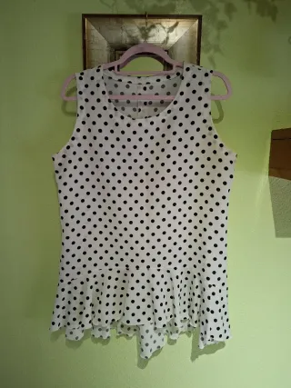 Blusa para leggings blanca con lunares negros con volante mas larga por detrás.