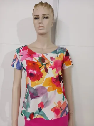 Blusa de manga corta con un vibrante estampado floral. - Diseño de acuarela con flores en tonos rosas, naranjas y amarillos. - Cuello redondo. - Corte favorecedor. Pecho 44 cm×2 Largo 54 cm