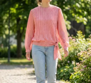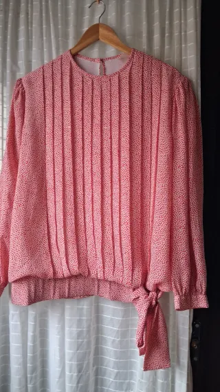 Blusa con un diseño romántico y detalles de lunares. - Mangas largas abullonadas. - Cuello redondo. - Detalle de lazada lateral. - Plisado en la parte delantera. MEDIDAS: Ancho de axila a axila: 60 cm Ancho de hombros: 46 cm Largo total: 68 cm ESTADO: Excelente. La prenda se encuentra en perfecto estado de conservación, sin signos visibles de desgaste, roturas o decoloración. El plissado mantiene su forma original. Corte holgado y fluido que favorece todo tipo de siluetas. Dale un toque vintage-chic a tu armario! #BlusaLunares #EstiloVintage #ModaSostenible #RopaSegundaMano #FashionFinds #PolkaDots #BlusaRoja #TallaM #OOTD #Vintage