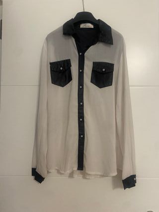 Elegante blusa blanca con detalles en contraste. - Cuello y puños en material negro. - Bolsillos frontales con solapa. - Botones frontales.