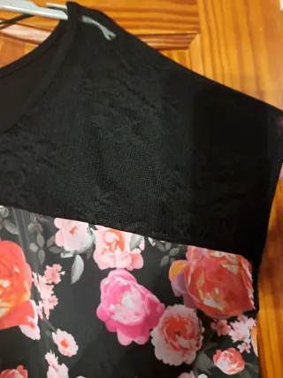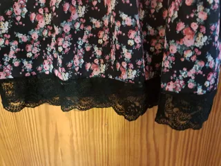 Blusa con un bonito estampado floral sobre fondo negro y detalle de encaje en el bajo. - Diseño con flores rosas y blancas. - Bajo con puntilla de encaje negro.