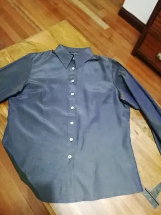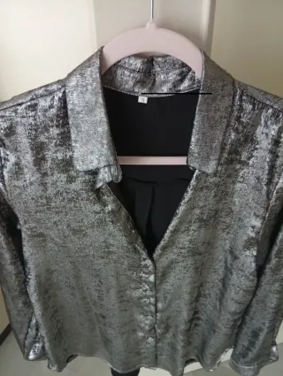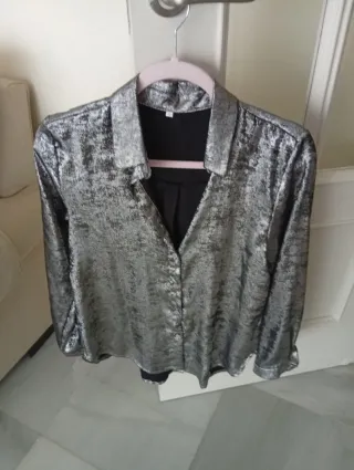 Elegante blusa con un acabado metalizado en tono gris y plateado. Su diseño la hace perfecta para ocasiones especiales o para añadir un toque de brillo a tu atuendo. - Cuello camisero. - Cierre de botones. - Manga larga.