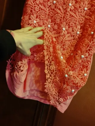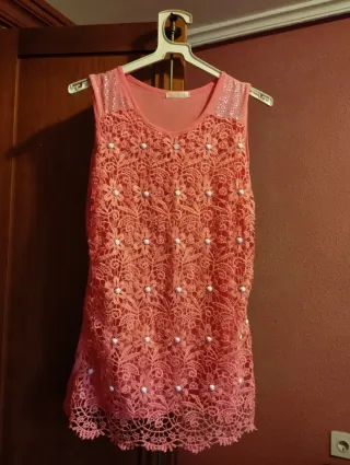 Bonita blusa de encaje sin mangas en tono coral. Perfecta para un look fresco y elegante. - Diseño de encaje floral. - Adornada con pequeñas perlas blancas. - Detalles brillantes en los hombros. - De cuello hasta abajo: 57 cm. - Ancho de axilas: 41 cm. 👀 ¡Mira más productos, complementos y ropa en mi perfil!👍🏻