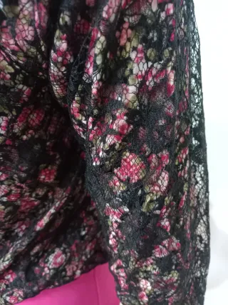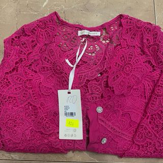 Elegante blusa de encaje con un vibrante color fucsia. Ideal para añadir un toque sofisticado a cualquier atuendo. - Diseño de encaje intrincado. - Cierre de botones frontales. - Mangas largas abullonadas.