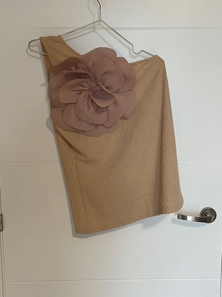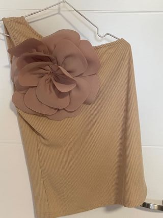 Blusa elegante con un diseño de un solo hombro y un detalle floral. - Color beige con aplique de flor en tono rosa. - Tejido acanalado.