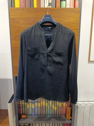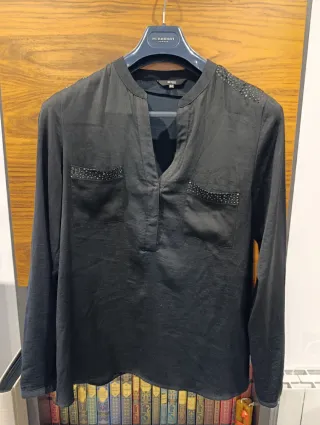 Elegante blusa negra de seda, perfecta para cualquier ocasión. - Detalle de pedrería en hombros y bolsillos. - Cuello mao con abertura. - Manga larga.
