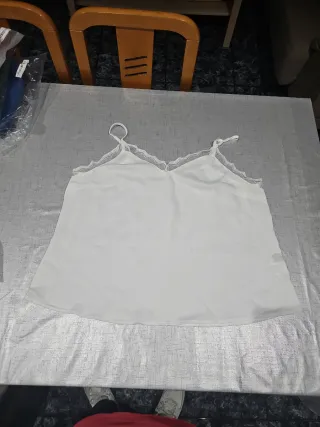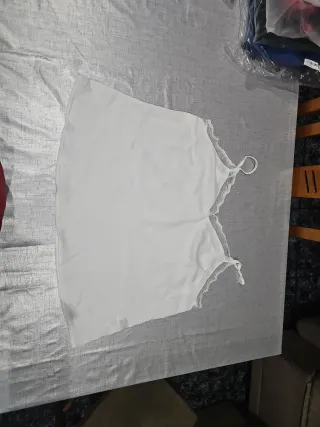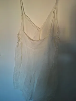 Prenda versátil en color blanco, ideal como vestido o blusa. - Diseño con tirantes finos. - Detalle de encaje en el escote. - Tejido ligero y vaporoso. - Capas de tela en la parte inferior.