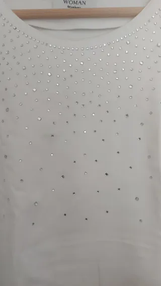 Blusa de manga francesa en color blanco roto, con un diseño de pedrería en el pecho que le da un toque brillante. - Detalles de pedrería en la zona del escote. - Diseño degradado de los adornos. - Tejido suave y cómodo.