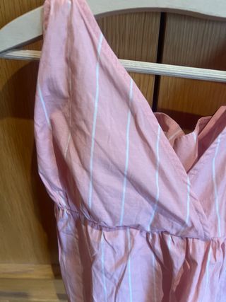 Blusa con un diseño de rayas verticales en color blanco sobre un fondo rosa. Presenta un escote en V y un corte fruncido en la cintura que le da volumen. - Diseño de rayas verticales. - Escote en V. - Corte fruncido en la cintura.