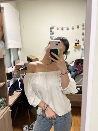Blusa blanca de manga larga con escote Bardot. - Tejido ligero y vaporoso. - Cintura elástica fruncida. - Diseño crop top.