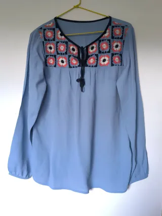Blusa de manga larga con un bonito bordado en la parte superior. - Diseño con escote en V y cordones. - Mangas largas con puños elásticos. - Detalle de bordado floral en tonos coral, blanco y azul.