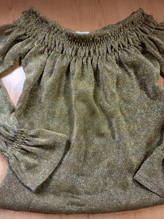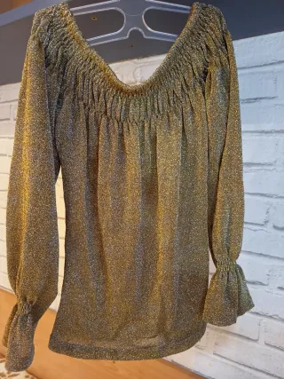Blusa con un llamativo brillo dorado, perfecta para añadir un toque festivo a tu atuendo. - Diseño con escote elástico. - Mangas largas abullonadas con detalle de volante en el puño. - Tejido ligero y con destellos.