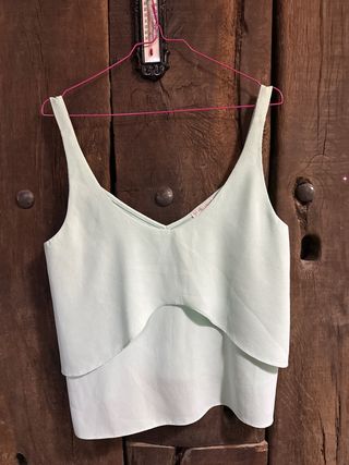 Blusa de tirantes con un diseño de capa superpuesta. - Tejido texturizado. - Escote en V. - Diseño asimétrico. - Color verde menta