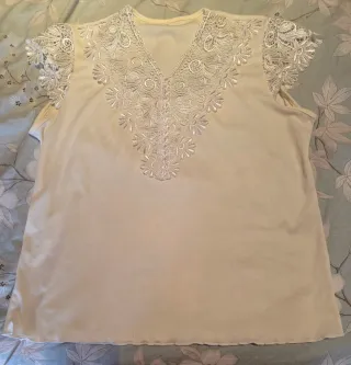 Elegante blusa beige con detalles de encaje blanco en cuello y mangas. - Diseño con escote en V. - Mangas cortas con encaje. - Adorno de encaje en la parte delantera. - Talla única ( da un M/L aprox)