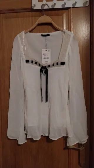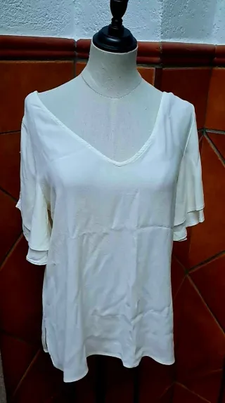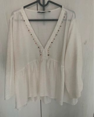 Preciosa blusa de Zara, sin estrenar. Es de color blanco y tiene un diseño delicado con detalles de piedras en el escote. Es muy bonita, me la compré y no la llegué a usar nunca. - Talla: (L) - Manga tres cuartos - Bajo con vuelo - Cuello en pico - Medida de axila a axila 54-55cm.