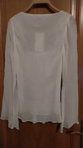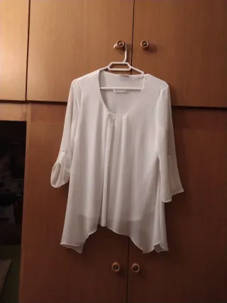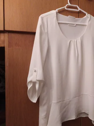 Blusa blanca de tela ligera y fluida, con un diseño moderno y favorecedor. - Manga larga con detalle de vuelta. - Escote redondo. - Corte asimétrico. - Diseño plisado en la parte delantera.