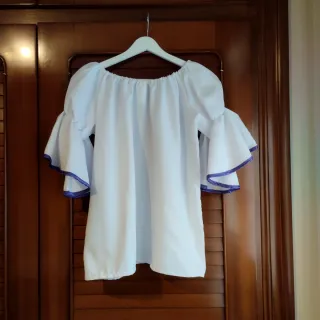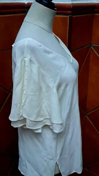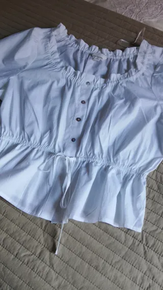 Blusa blanca con detalle de vuelo. Sin estrenar - Escote elástico con volantes. - Cierre de botones en la parte delantera. - Cintura ajustable con cordón. - Mangas abullonadas.
