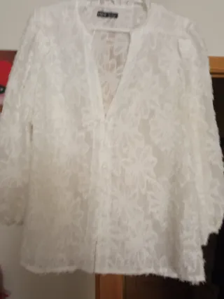 Elegante blusa blanca con detalles de guipur y pedreria. Blusa blanca guipur Amichi talla S con detalles pedrería color plata en escote en v, manga transparente y forro blanco en resto, manga larga con botones en puño.