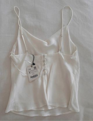 Elegante blusa de tirantes de Zara, confeccionada en un tejido suave y sedoso. - Diseño con escote drapeado. - Tirantes finos ajustables. - Corte fluido y ligero.