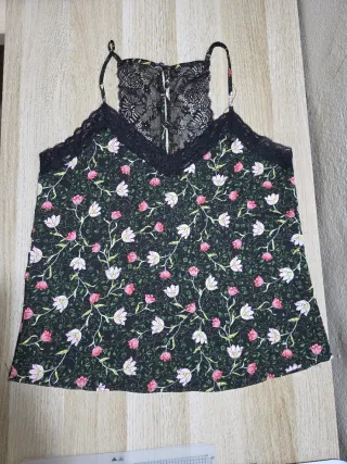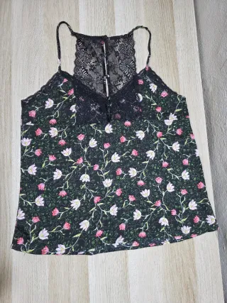 Bonita blusa con un estampado floral y detalles de encaje. - Diseño con tirantes finos. - Escote en V. - Adorno de encaje en el escote y la espalda. - Estampado de flores rosas y blancas sobre fondo negro.