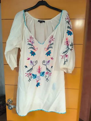 Blusón blanco con un bonito estampado floral bordado en el pecho y las mangas. El escote y el bajo tienen un detalle de puntilla Axila axila 60 cm largo 90 cm - Diseño con escote en pico. - Mangas largas abullonadas. - Bordados multicolor.